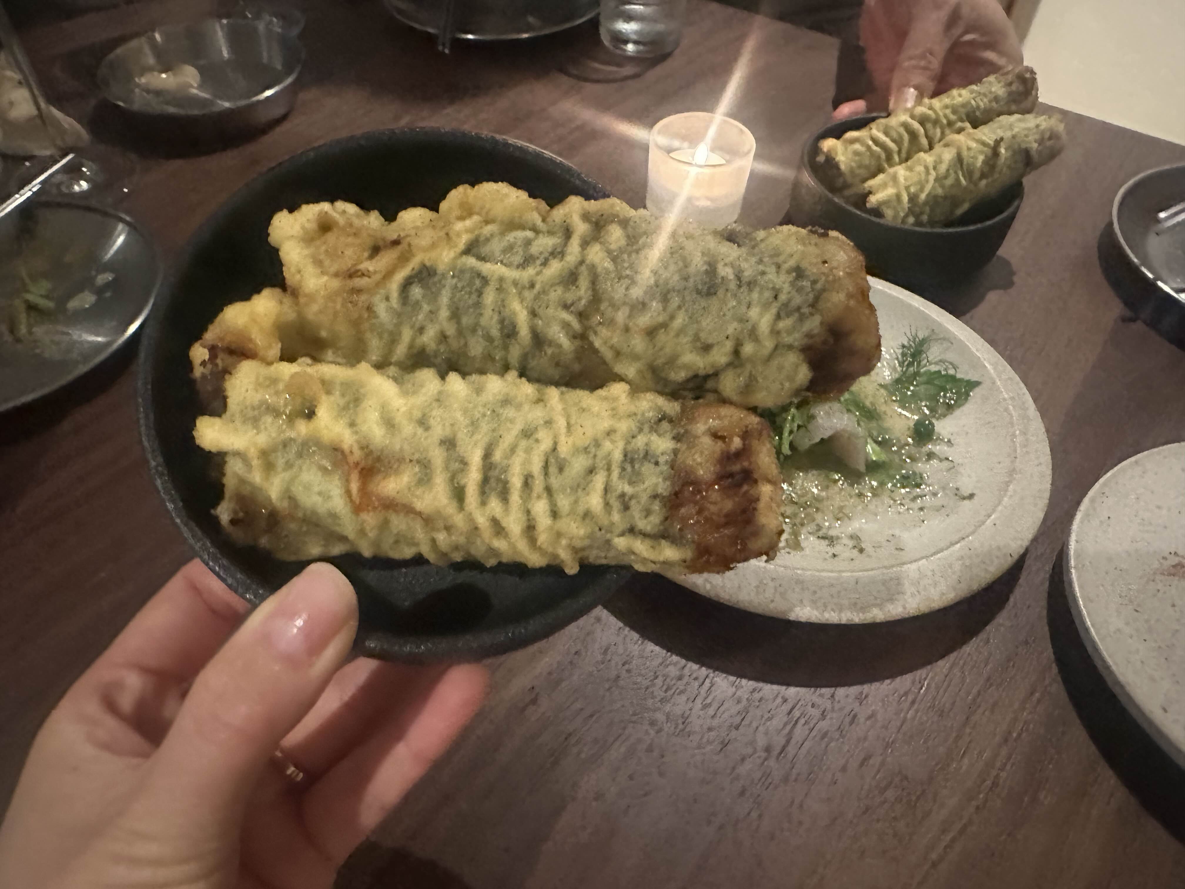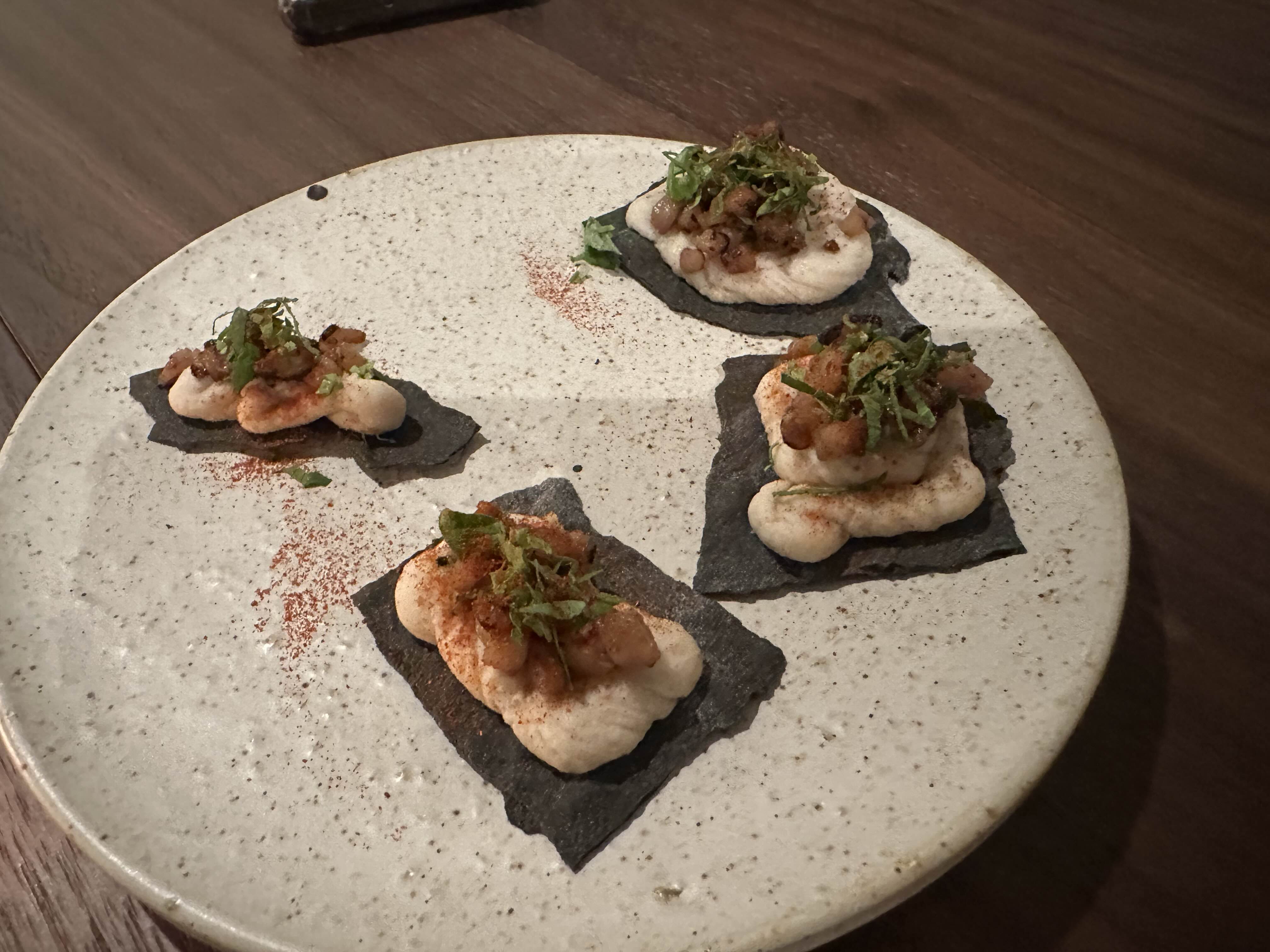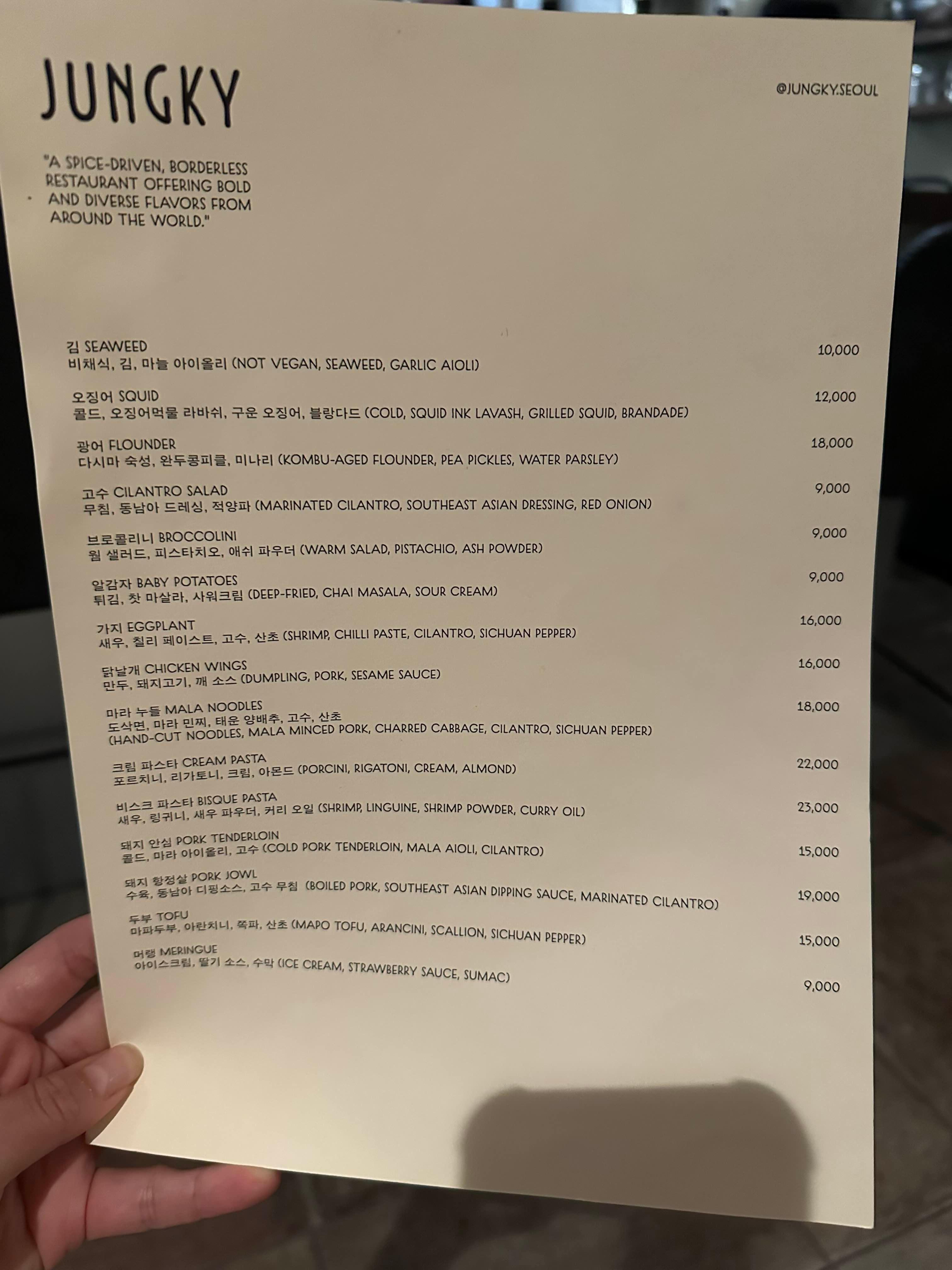 자리에 앉자마자 가볍게 화이트와인 한 잔을 주문하고, 함께 곁들일 오징어 요리(12.0)로 식사를 시작했어요. 정키는 스몰 디쉬 중심의 메뉴 구성이라 여러 가지 음식을 부담 없이 다양하게 맛볼 수 있다는 게 가장 큰 장점이에요. 가성비도 좋아서 와인과 페어링할 메뉴 고르기가 즐거웠답니다.