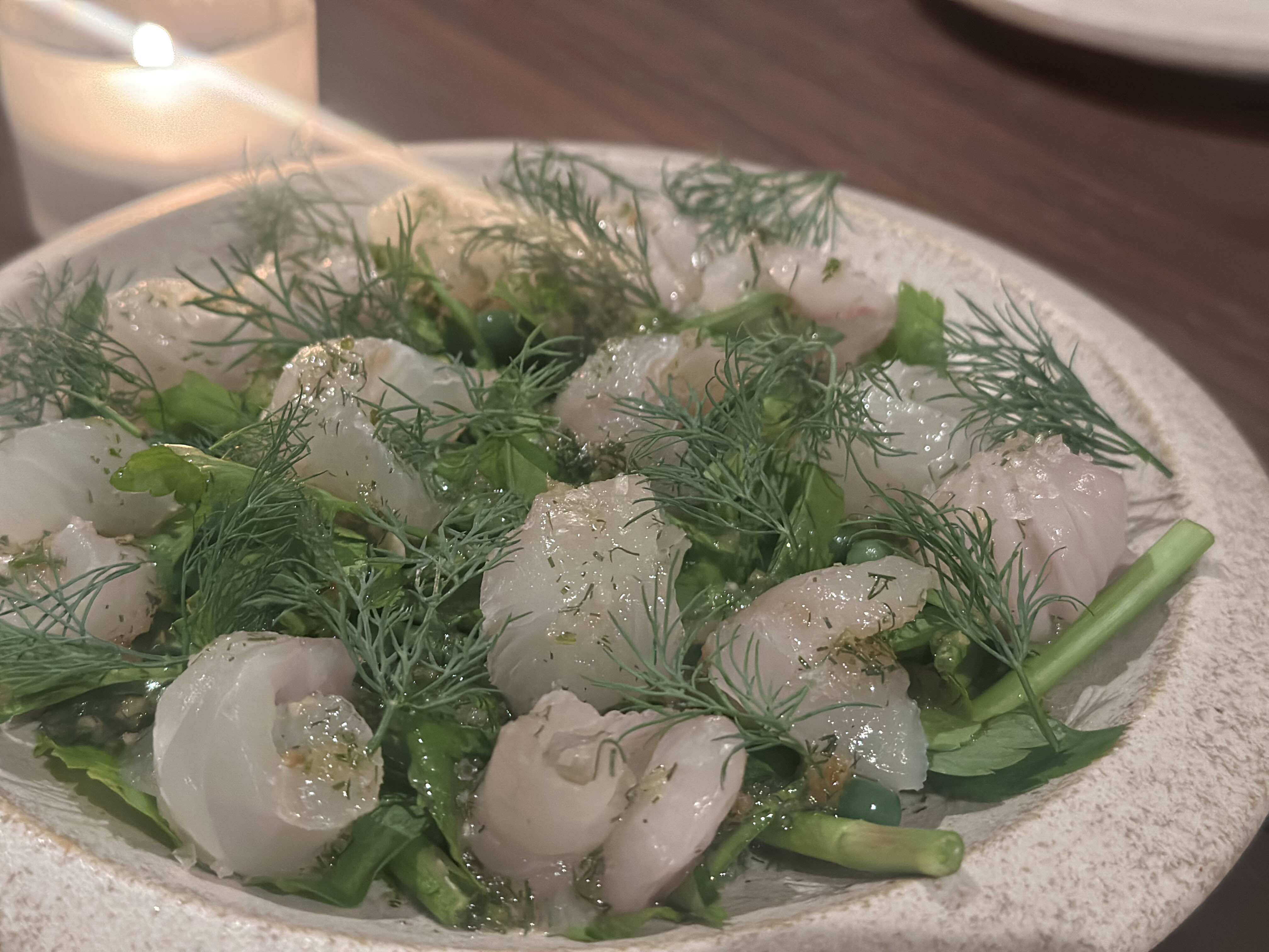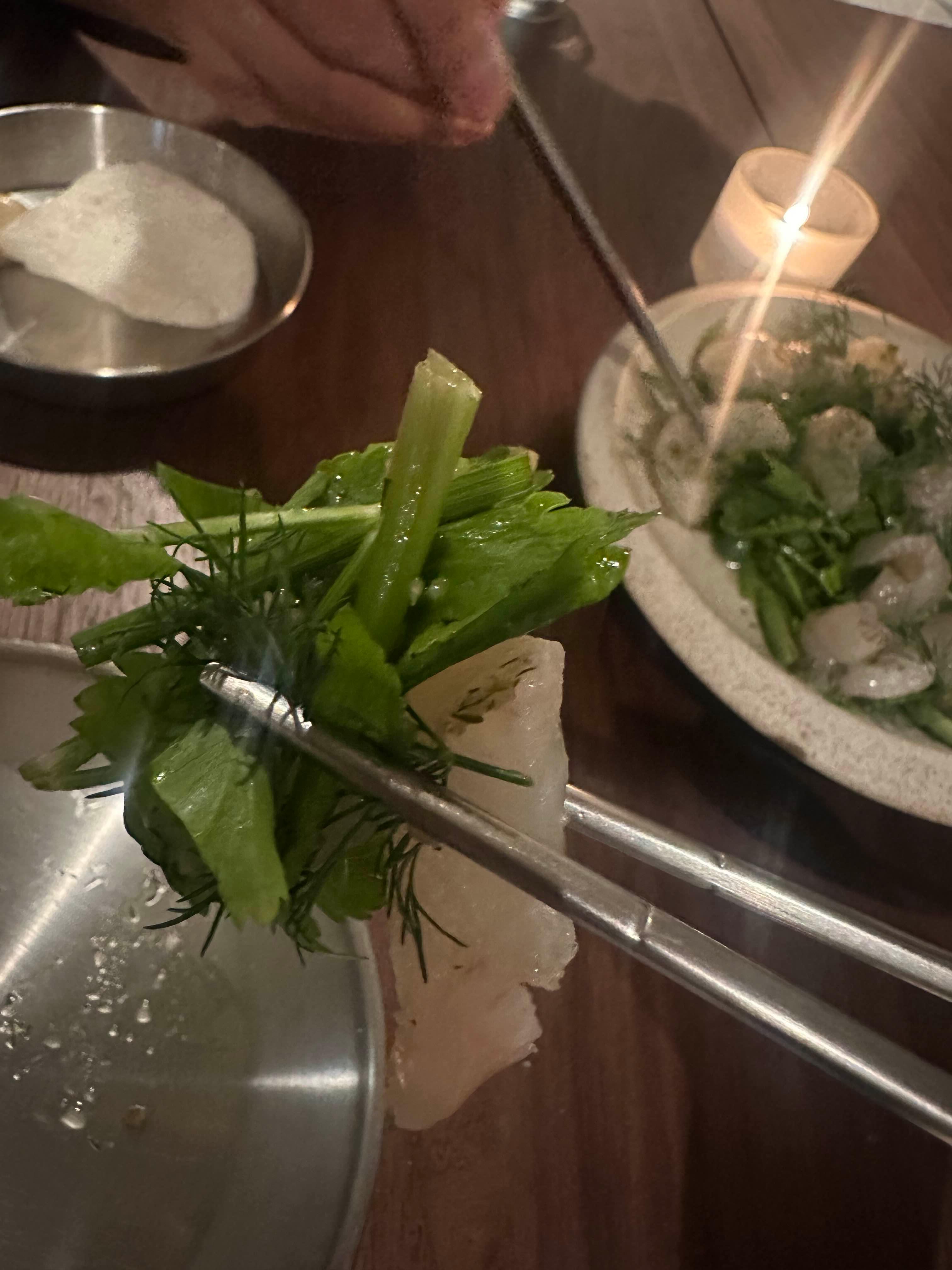 광어는 미나리와 완두콩 피클이 곁들여져 있어 깔끔한 산미와 담백함이 조화를 이루고 있었고,