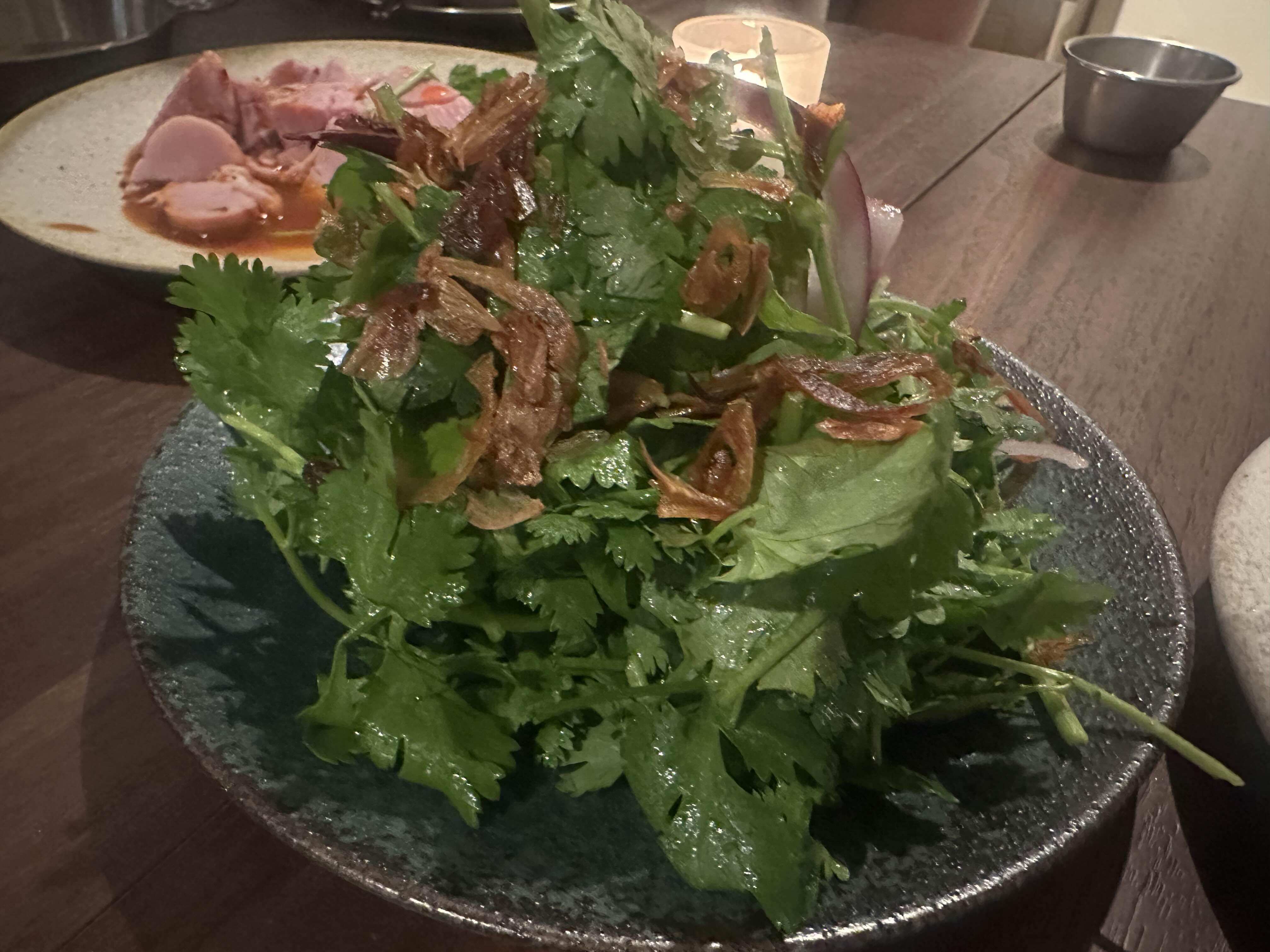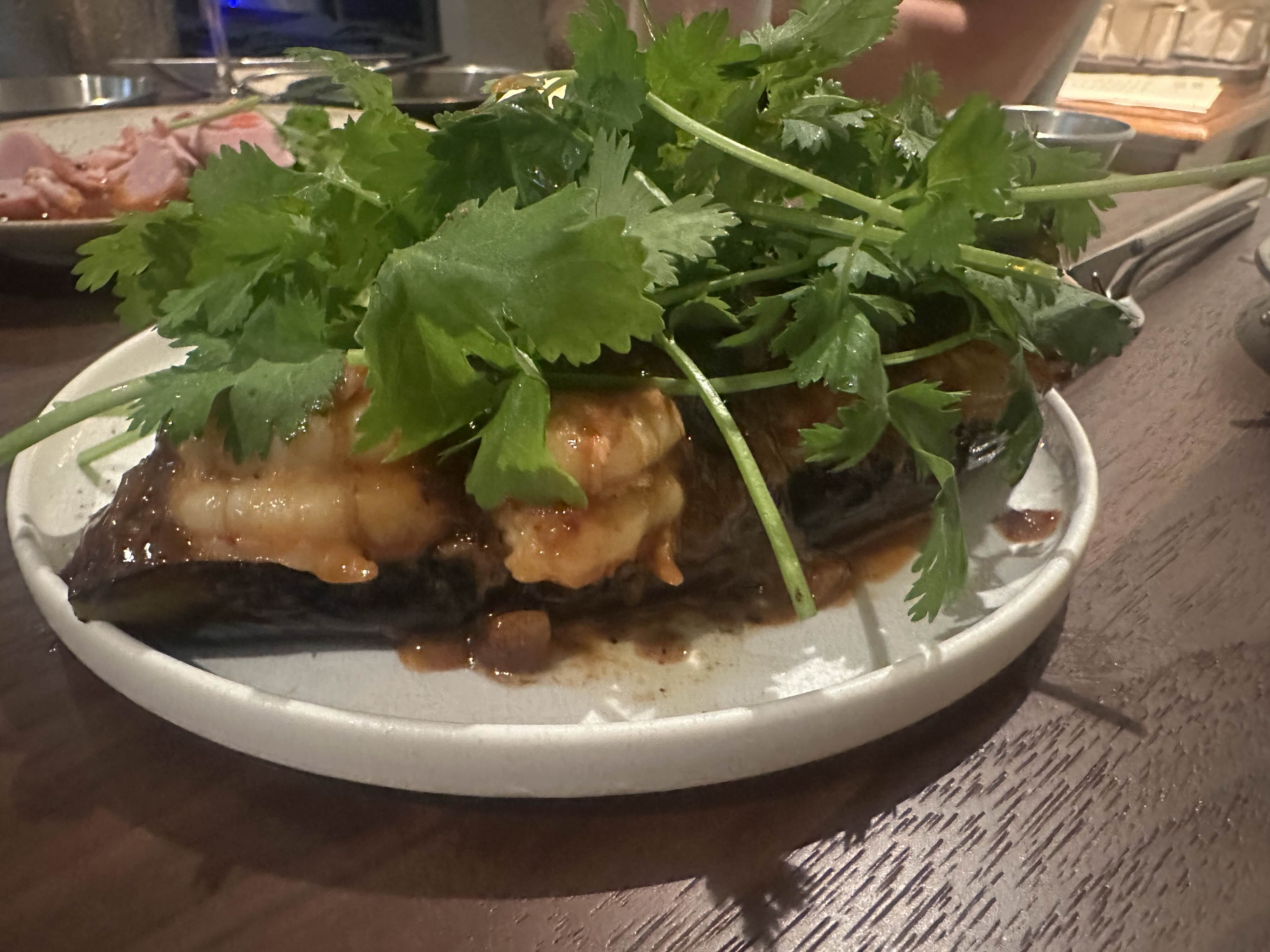 고수 마니아인 멤버들을 위해 고수 샐러드도 추가했는데요, 향긋한 허브향이 전체적인 식사의 흐름을 산뜻하게 정리해주는 역할을 해주더라고요. 이어서 주문한 가지(16.0)는 칠리페이스트와 고수가 더해져 이국적인 풍미가 매력적이었고,