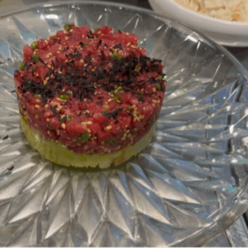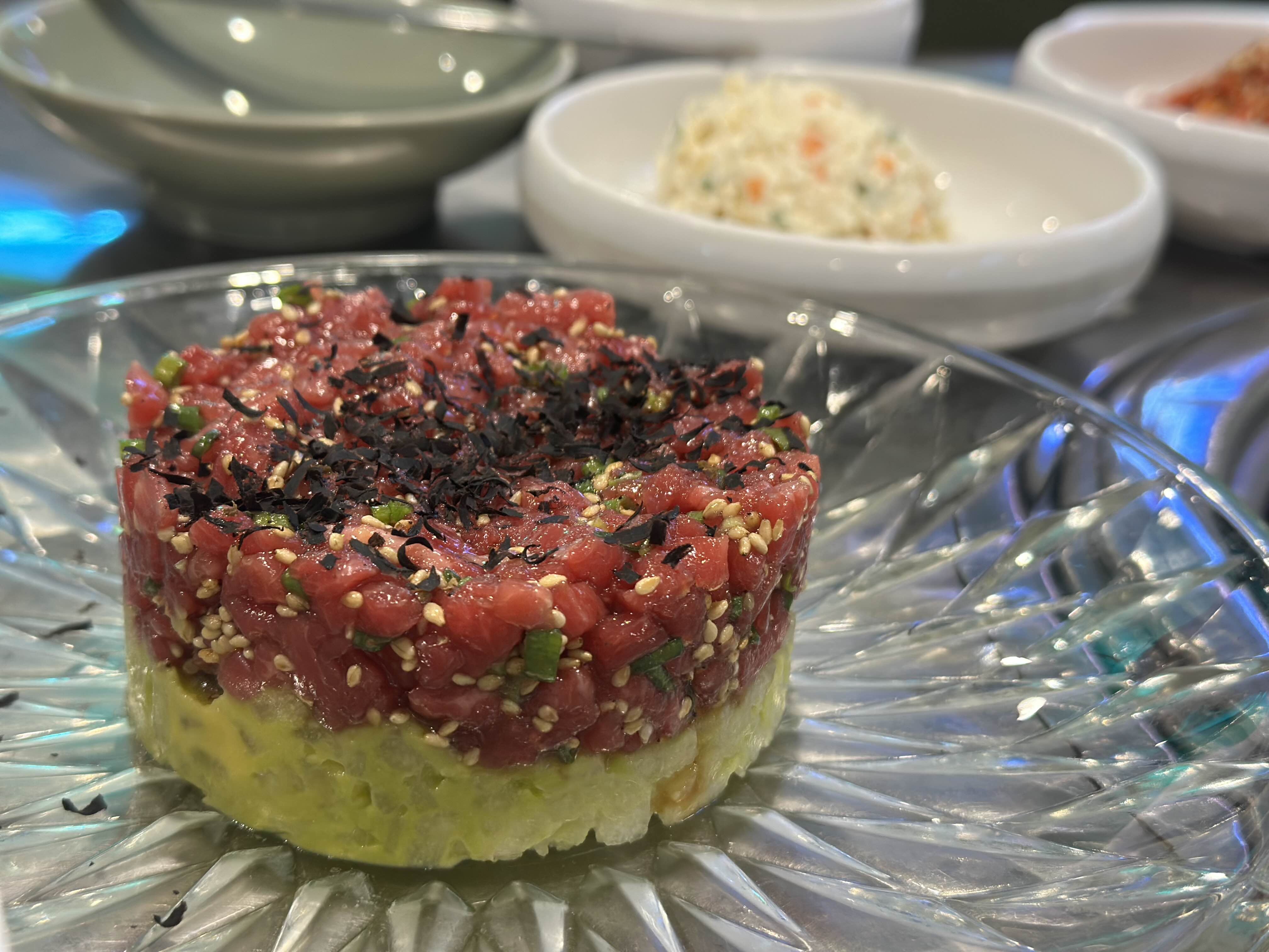육회 아래에 아보카도가 깔려 있는 독특한 구성으로, 함께 떠먹는 방식입니다.